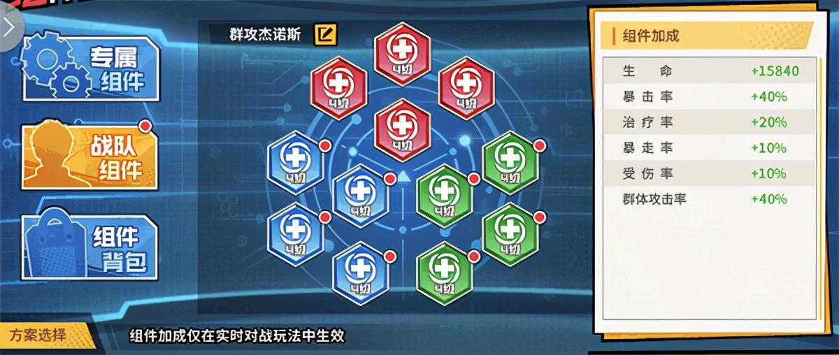 该阵容顾名思义需要两位依靠生命值输出的角色警犬侠、改造杰诺斯组合出场。改造杰诺斯作为目前版本最强的输出角色毋庸置疑,搭配觉醒蚊女、觉醒龙卷、警犬侠可顺理成章的完成收割。选择该流派的玩家,组件主要堆生命值即可,副属性红色组件选择【暴走率】、蓝色组件【暴击率】、绿色组件【群体攻击率】。专属组件改造杰诺斯推荐【战斗套】或【囚犯套】、【复苏组件】、【迅捷组件】,警犬侠推荐【僧侣套】、【极被动组件】或【复苏组件】、【迅捷组件】。推荐拥有较好生命值属性组件的伙伴优先选择该阵容进行上分。