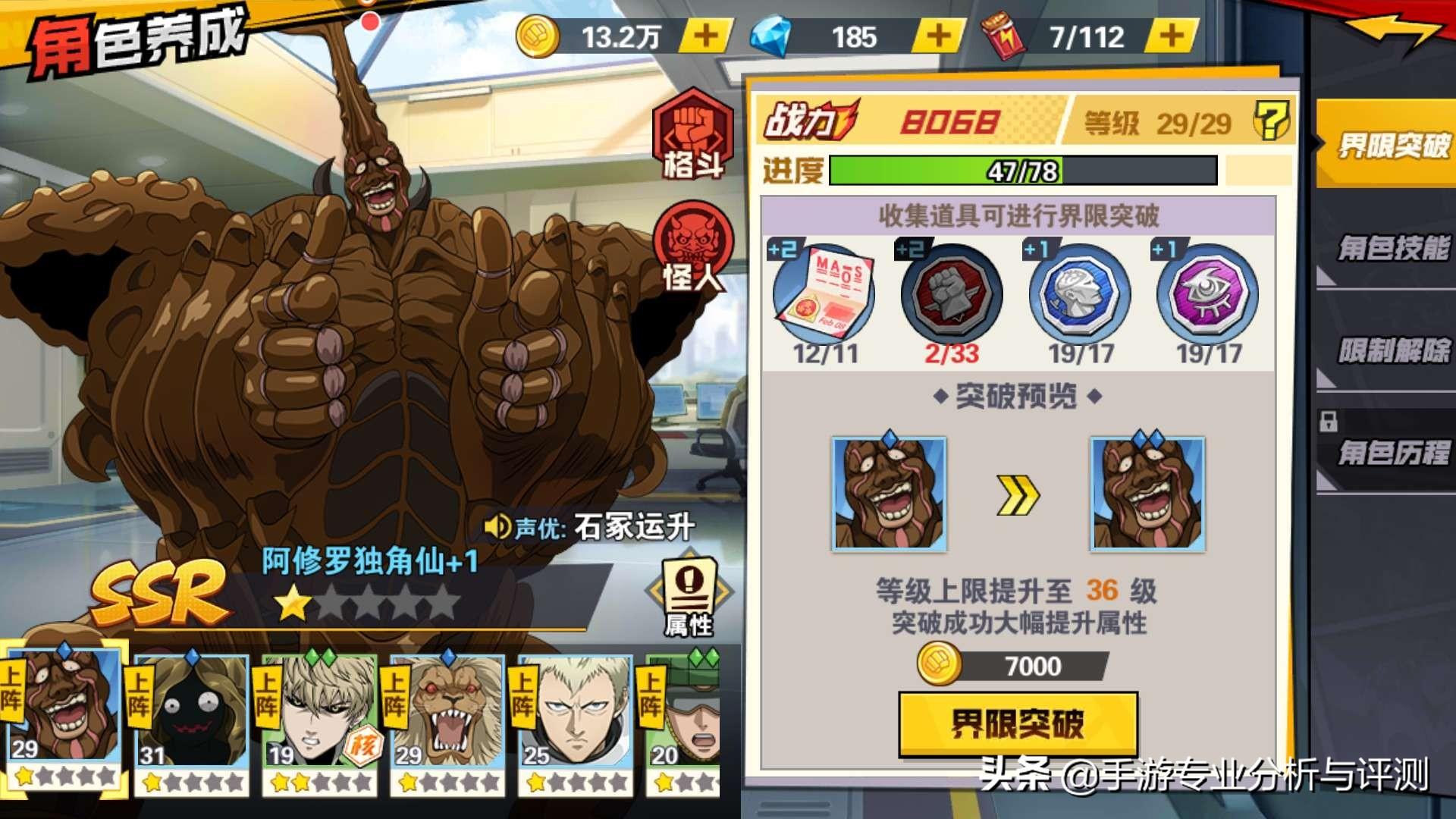 《一拳超人》的养成系统与其他卡牌游戏类似,包括多英雄养成和英雄深度养成。英雄深度养成包括角色养成和装备养成。角色养成又包括界限突破(消耗资源升级英雄)、角色技能(角色技能升级)、限制解除(角色升星)以及角色历程。