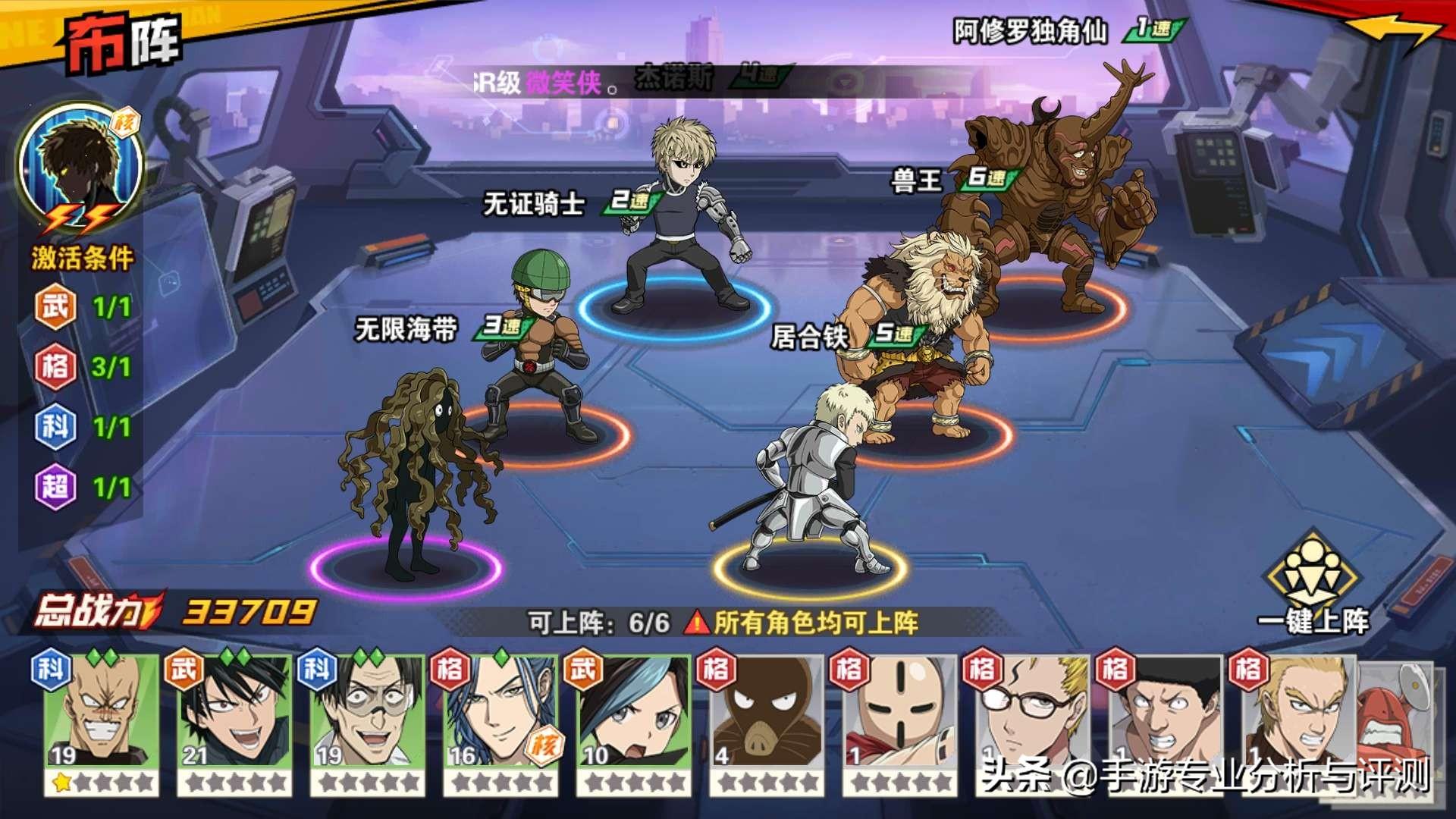《一拳超人》没有如九宫格的阵法设定,只有前后两排共6个位置。角色的普攻和技能有单体攻击、列攻击、排攻击、后排攻击、AOE攻击。没有阵法会让玩家省掉在阵法研究上的时间,专心养成角色,再进行PVP和PVE。没有多余位置就无法将上阵角色分散,上阵的角色被攻击时只能硬抗,一定程度上也缩短了对局时长。当然,对手也无法分散角色,一般情况下玩家技能攻击对手时,不管是排、列都能至少攻击2个敌方角色。简单的操作会让普通玩家对游戏操作有一定信心和成就感。
