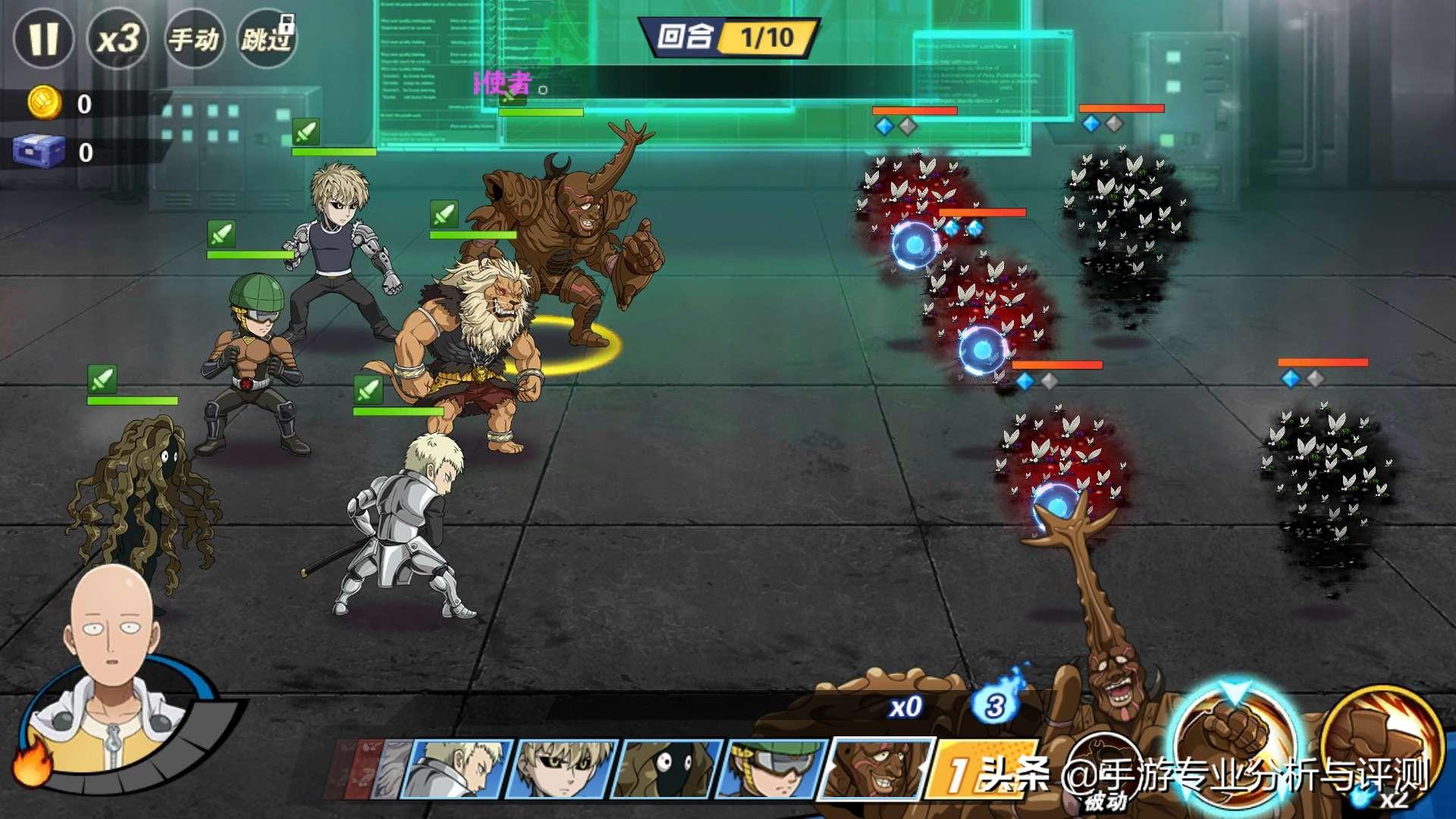 战中指挥有一定策略性,需要根据对手角色位置选择自己的角色释放技能,配合埼玉的大招释放时间和对象,就是战斗的所有策略。角色技能动画时间较短,基本1-2秒播放完毕,不需要玩家手动关掉。