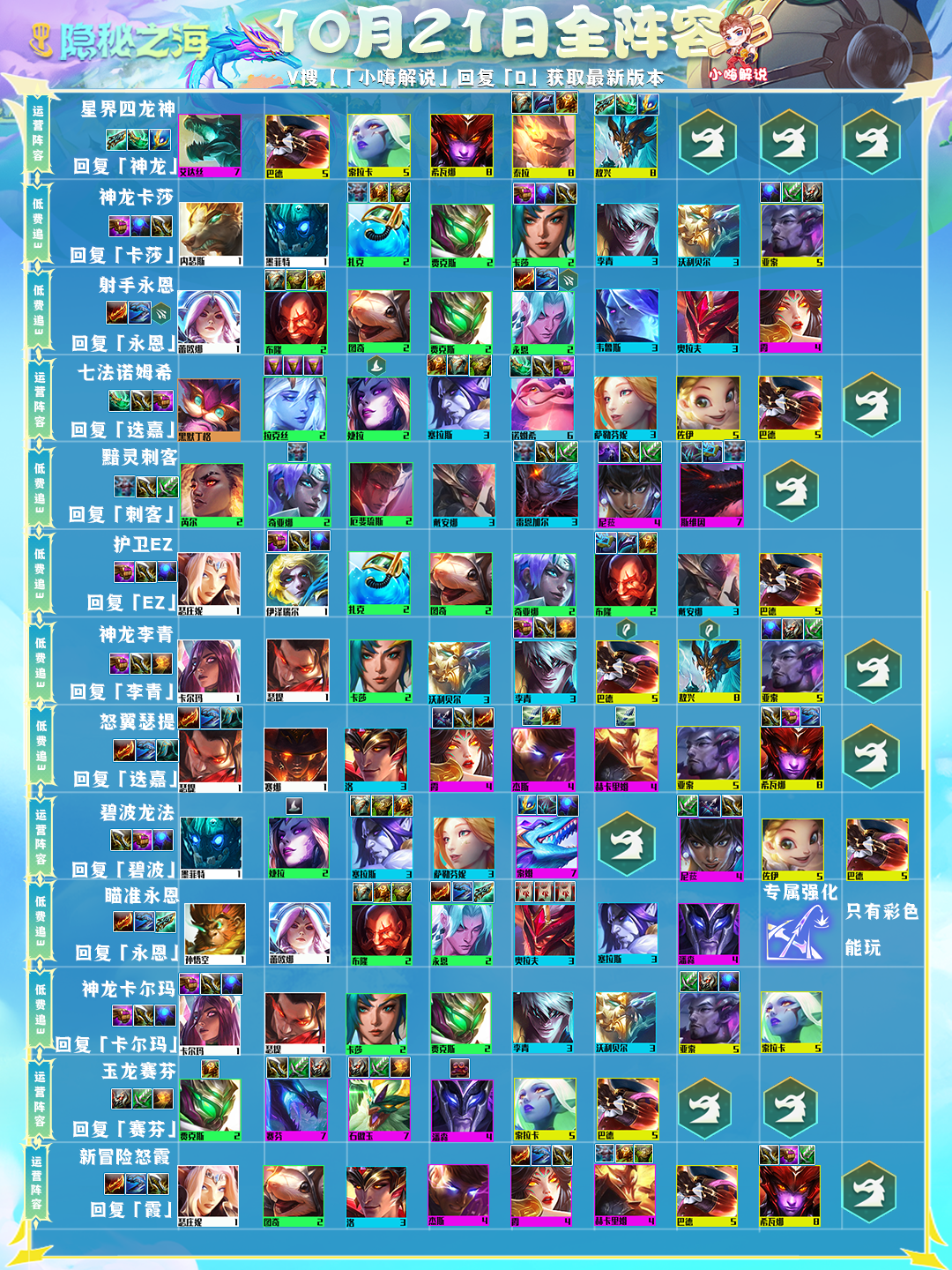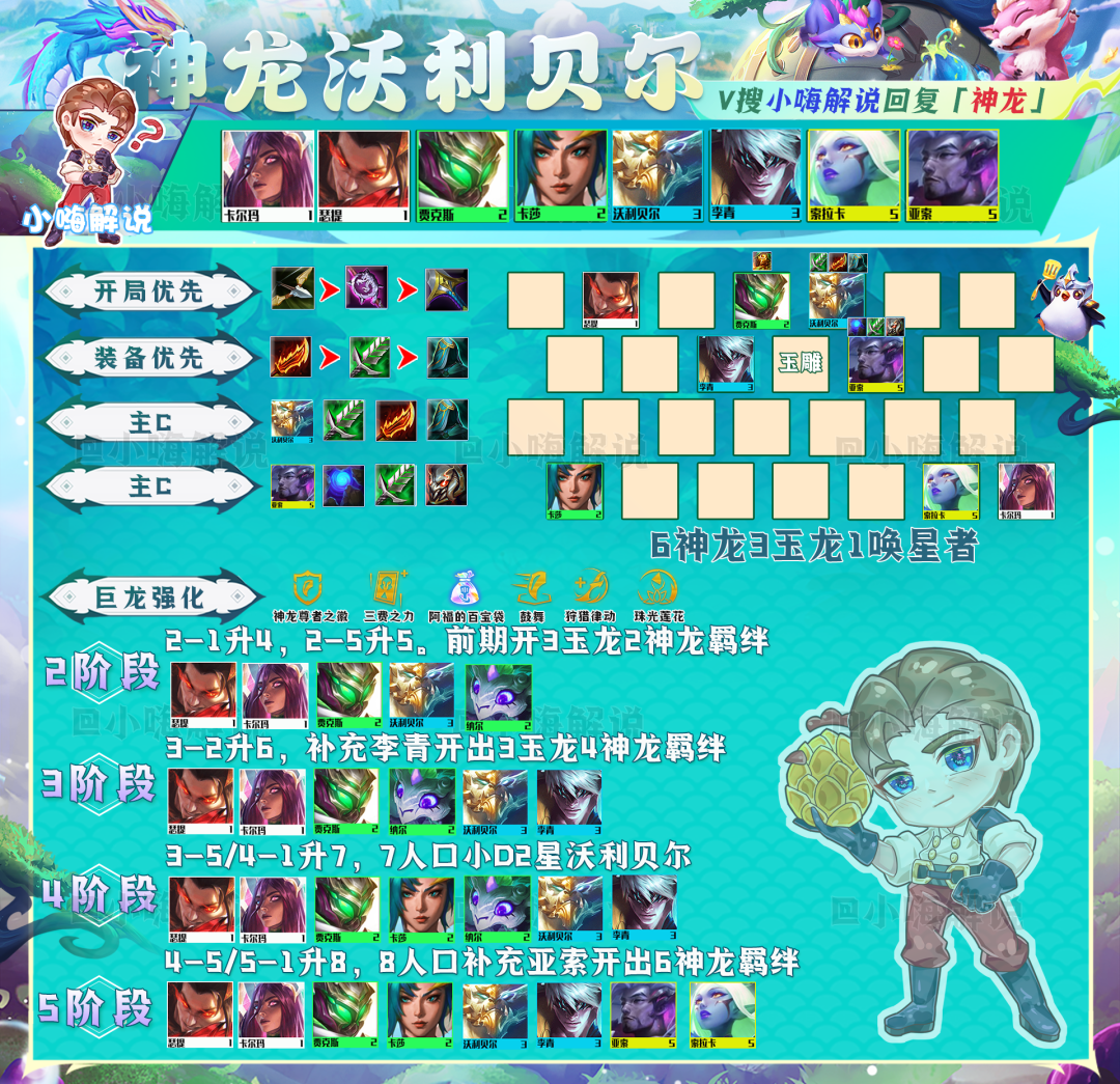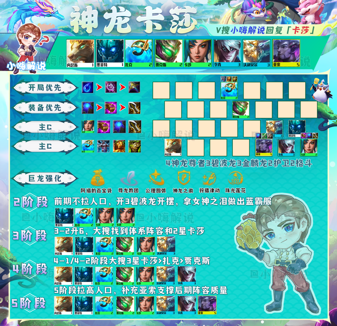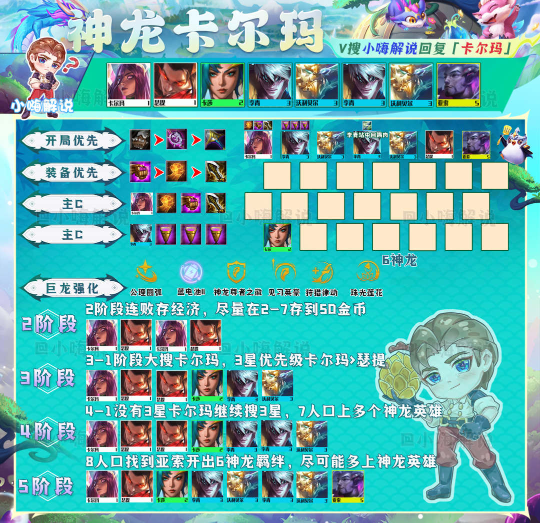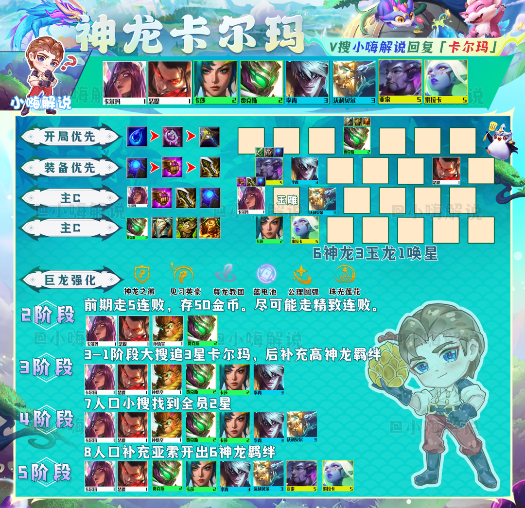 阵容解析:神龙卡尔玛削弱了3星的技能伤害,但是本次削弱只有20点技能伤害,影响不是特别大,依然是版本热门的上分阵容。