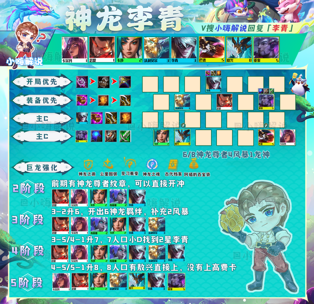阵容解析:4神龙的加强,极大的提高了神龙李青在中期的过渡能力。3星李青基本就是吃鸡的配置,其次8神龙也是上分的首选,跟其他神龙体系阵容一样,有公理圆弧和风暴之眼可以直接开冲。