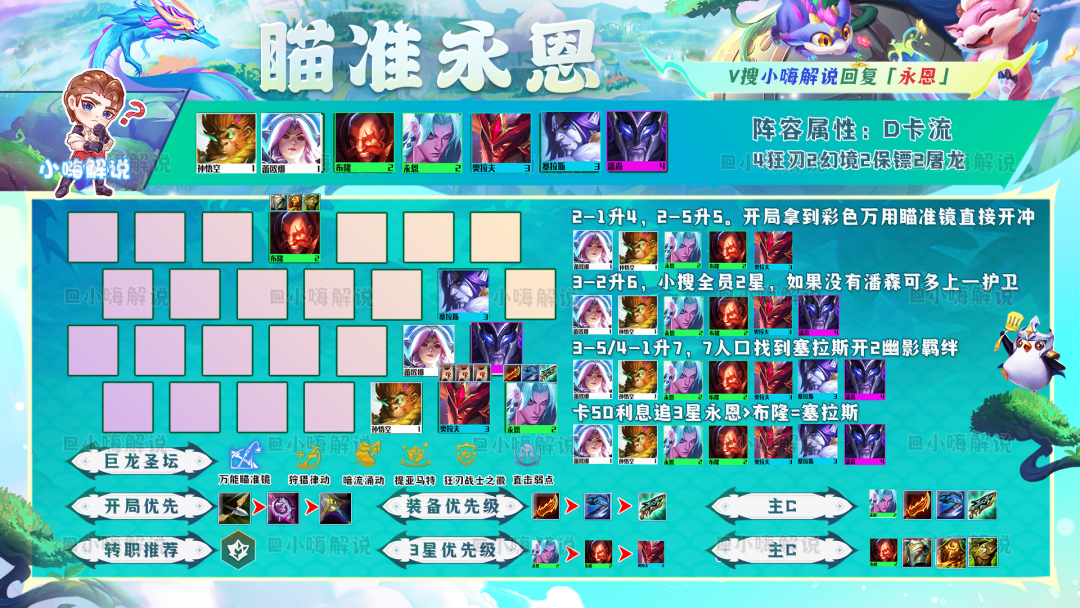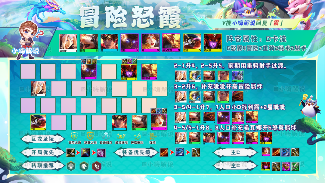 阵容解析:其次敖兴虽然削弱了最大法力值,正常情况下只是需要多平A2下就能释放技能。对于冒险敖兴而言,开局高攻速就是关键,启动能力会远远大于四龙敖兴,同时敖兴技能伤害的加强,也无疑是冒险体系的大提升。