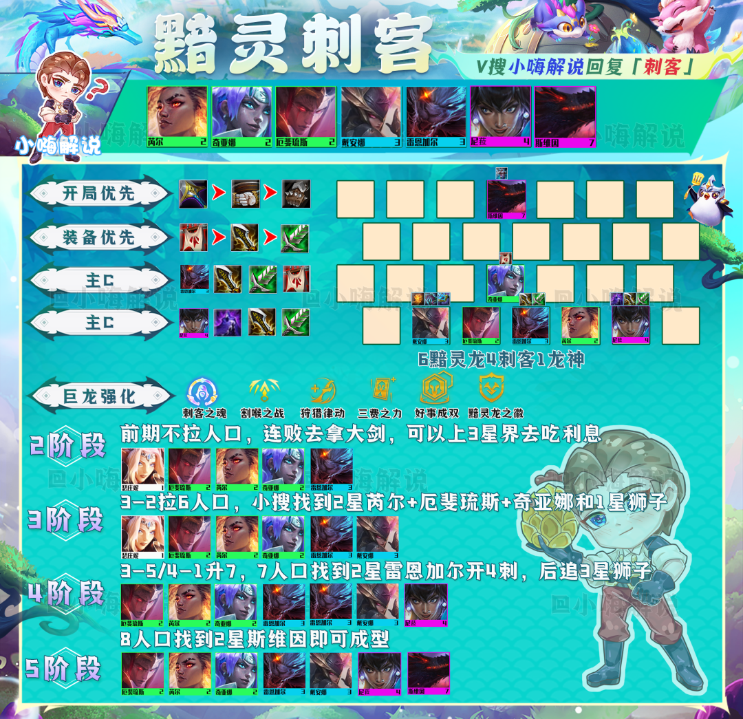 阵容解析:刺客、斯维因加强,雷恩加尔的伤害削弱,总的来说对于传统黯灵4刺是削弱的,但是3星雷恩加尔的强度则没有太多的变化。有好事成双开局,是可以直接冲的!