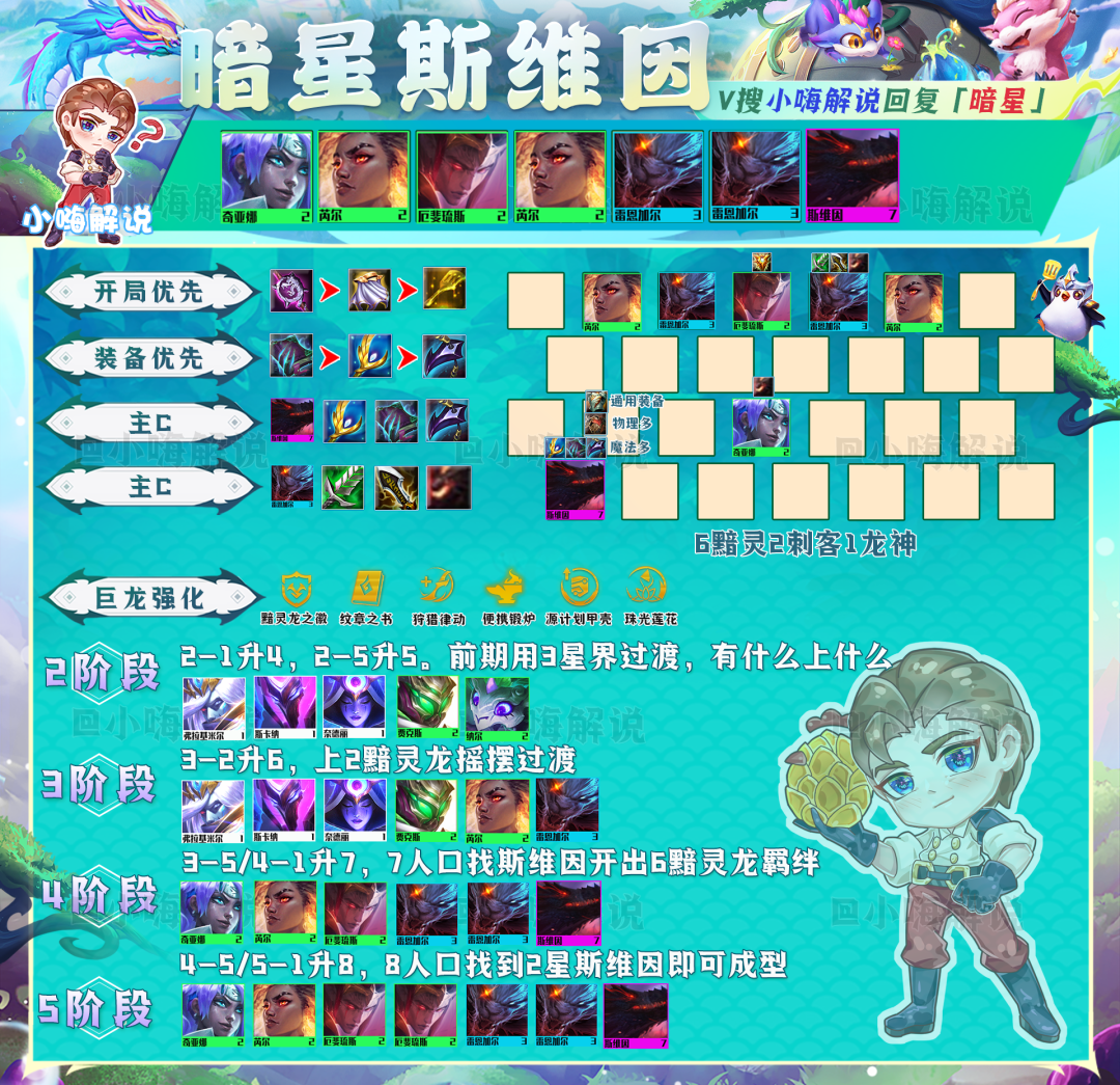 阵容解析:相对于传统的黯灵刺客,暗星斯维因的强度高很多,得力于斯维因的加强,基本上全员2星吃分还是比较简单的。想要吃鸡则需要追到3星雷恩加尔。