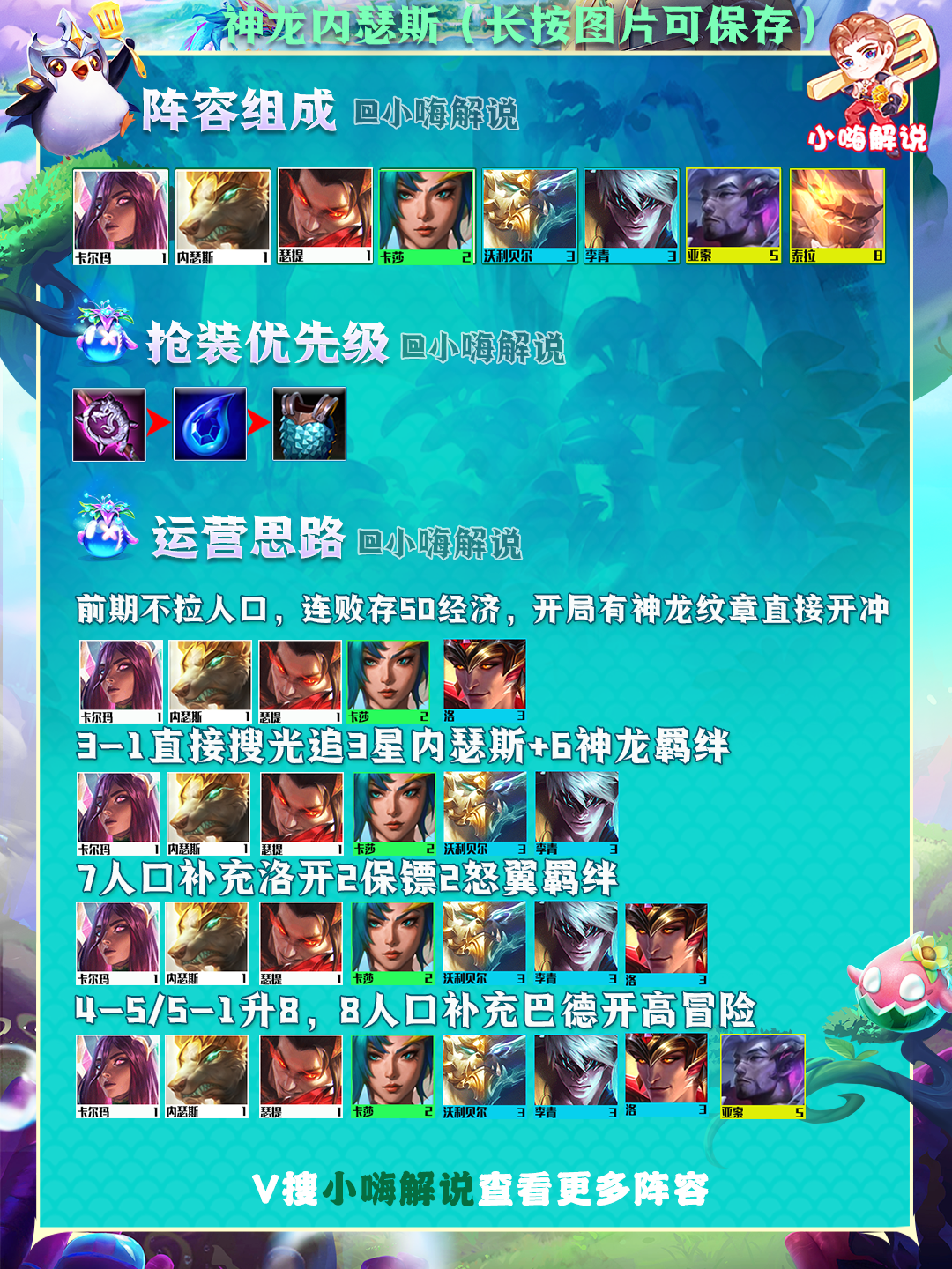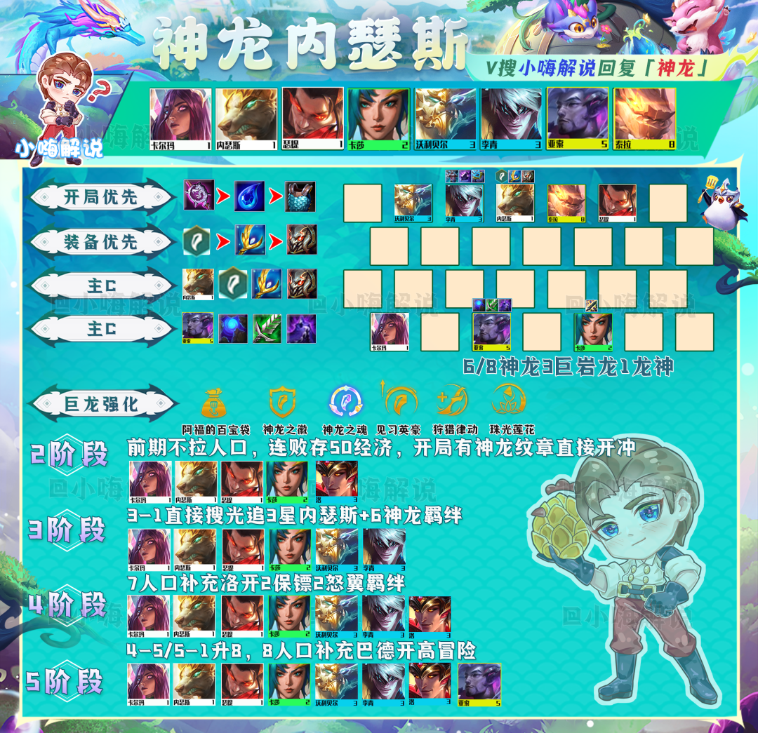 4阶段:4-1阶段如果内瑟斯没有3星,直接去追3星内瑟斯。内瑟斯3星直接拉6人口补充6神龙羁绊,7人口再上洛开出6神龙2护卫2怒翼羁绊。