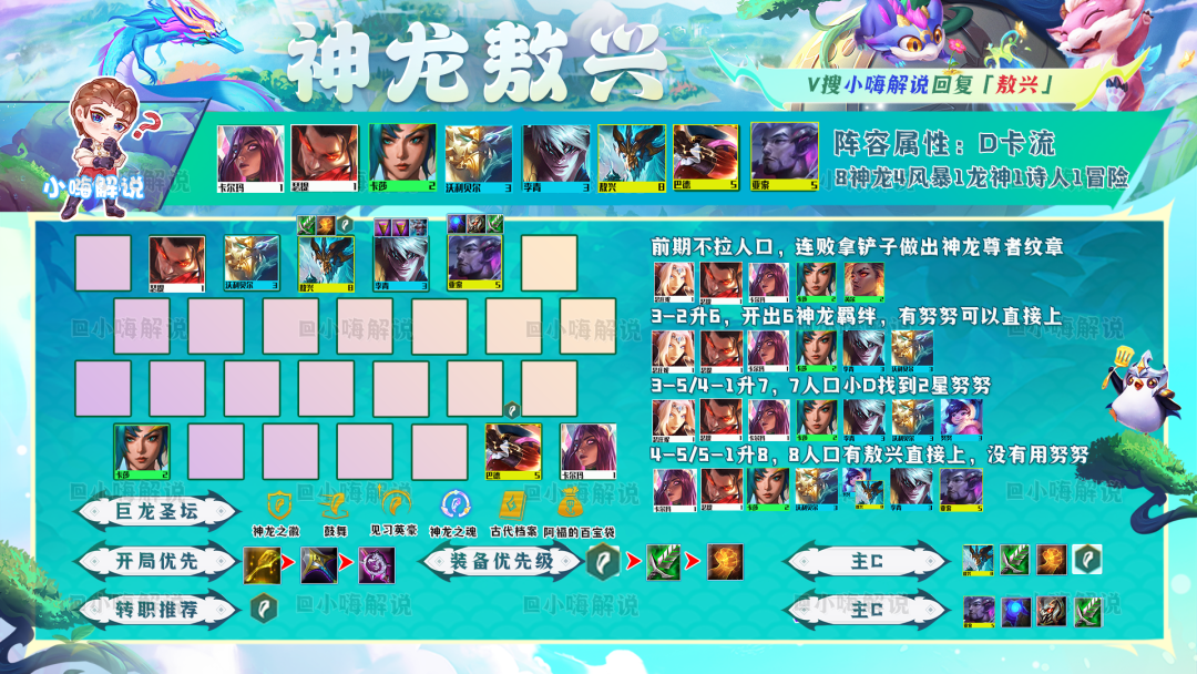后期阵容:8人口有2个神龙纹章,大搜卡找到亚索卡出8神龙羁绊,神龙纹章给洛即可,8神龙内瑟斯基本稳定吃分。