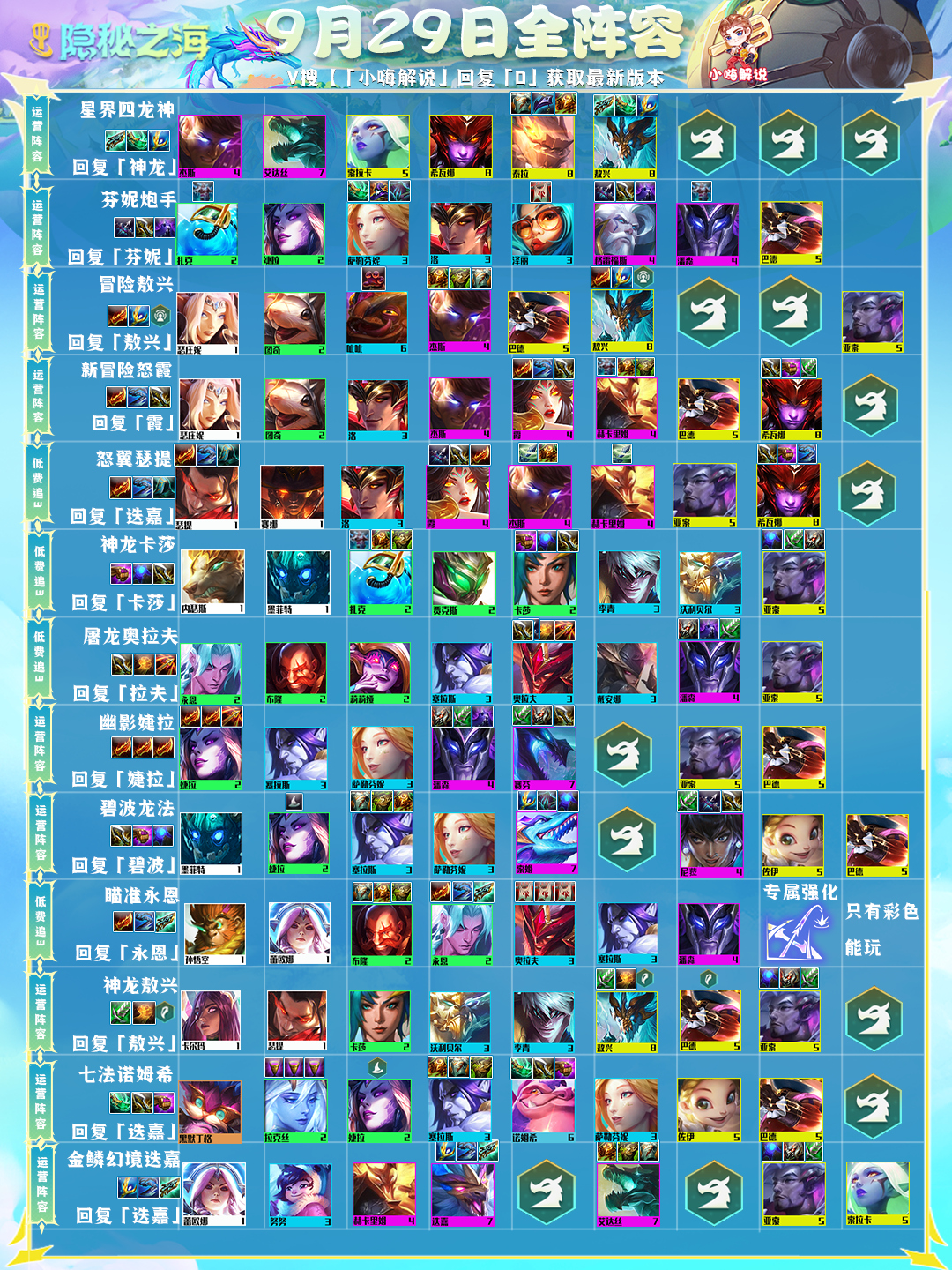 其次像怒翼瑟提、黯灵刺客等高爆发的阵容,依然是版本的首选上分思路。芬妮炮手、怒翼霞、瞄准永恩、屠龙拉夫等也是不错的选择。