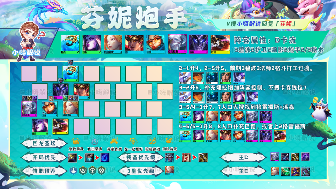 阵容解析:芬妮炮手是炮手在当前版本的正确答案,但是阵容核心并不是高炮手,而是3星萨勒芬妮。有3星芬妮的情况下,打没有大成的四龙神还是比较好打的,特别是1星敖兴的技能伤害已经不能够秒掉带有护盾的英雄,而格雷福斯的爆发能够直接轻松将其带走。