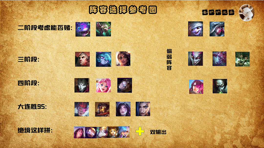 对整体阵容情况有所了解以后,大家可以发现,T0的7个阵容里有5个是赌狗,那主流D牌提质量环境一定是3-1、3-2,像云顶那样4-1冲某个四费卡阵容的节奏必死。那上分的大致思路也清楚了: