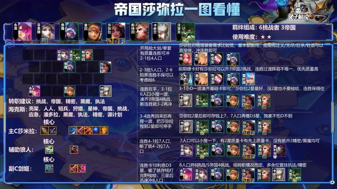 羁绊全部围绕莎弥拉展开,一点多余的都没有,所以铲子能做的转职也只有帝国转职以及挑战转职,纹章可以选择精密发条/执法纹章,挑战转职推荐给到男刀,挑战男刀非常好用,谁用谁知道,如果是后期才来可以考虑给到杰斯,杰斯放后排带挑战转是非常好用的,同时还能开执法,来帝国转职推荐给到剑姬,这样我们7人口开5帝国即可,帝国挑战体系有5帝国就是必开的,毕竟5帝国的伤害加持实在是太高了,就即使不挂挑战法也是要开5帝国的,最后来精密纹章随便挂即可,后期团队收益+25%攻速,非常好用,甚至条件允许的情况下,可以开4精密,超级好用,执法纹章也是随便挂即可,2执法就是灵风,也很好用。