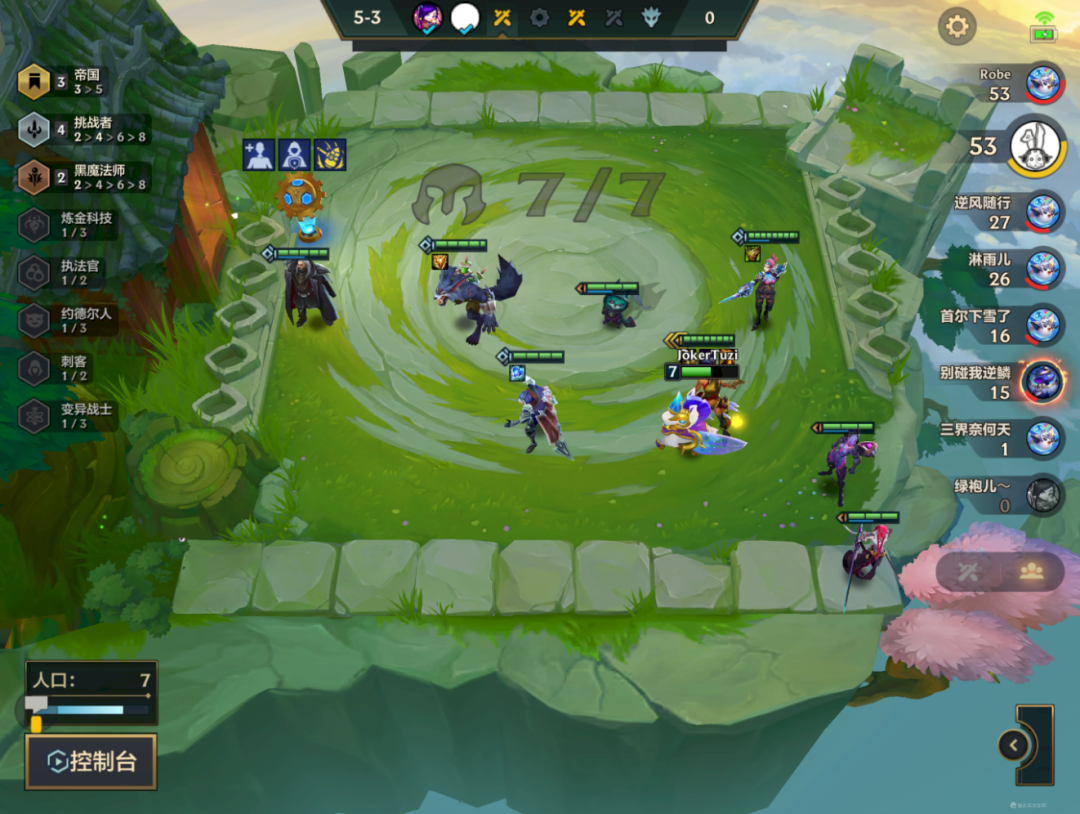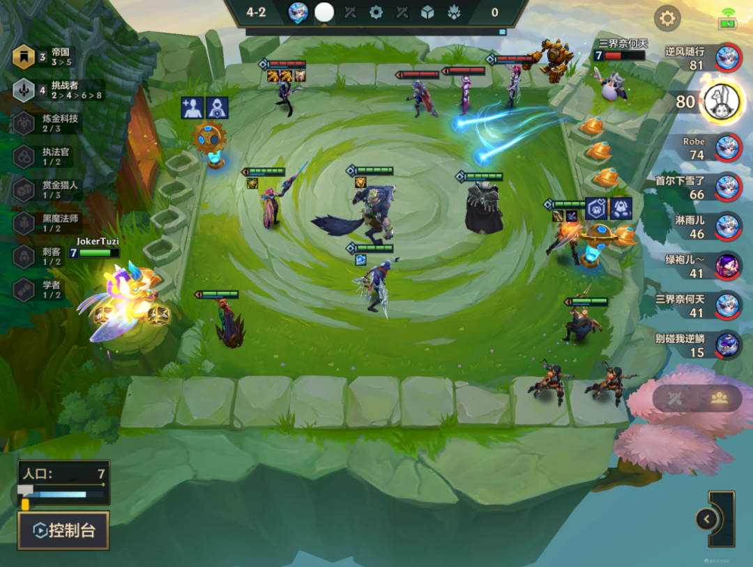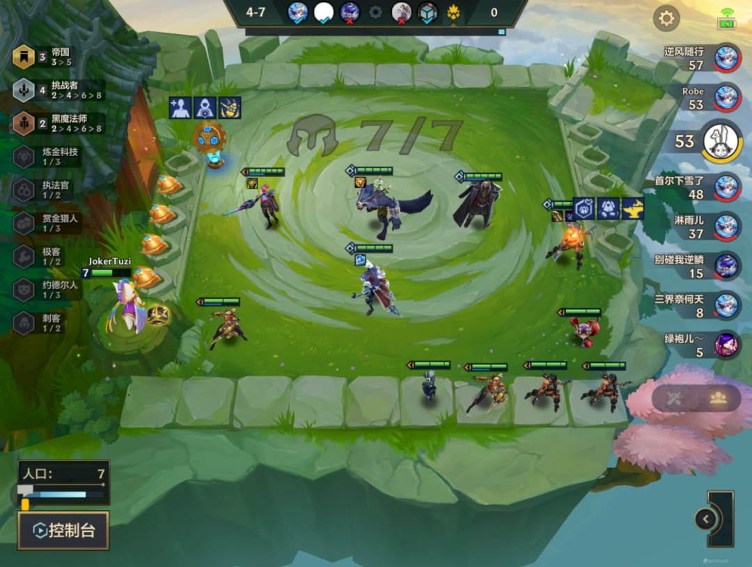 连胜经济好就4-1抢7人口,经济差像兔子这盘或者连胜断了就等4-2再拉7人口,7人口依旧是小搜即可,开2黑魔/2执法/2精密均可,优先上2星。