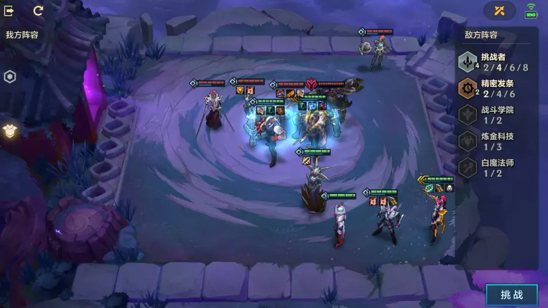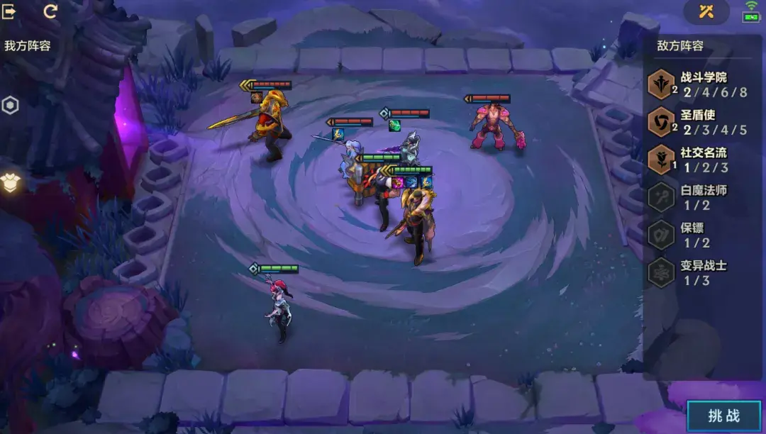第一关敌方4枚棋子,2战斗学院2圣盾羁绊,有个三星棋子盖伦。我方是3辛迪加与2保镖,同样有个三星棋子德莱厄斯,强度上差不多太多。