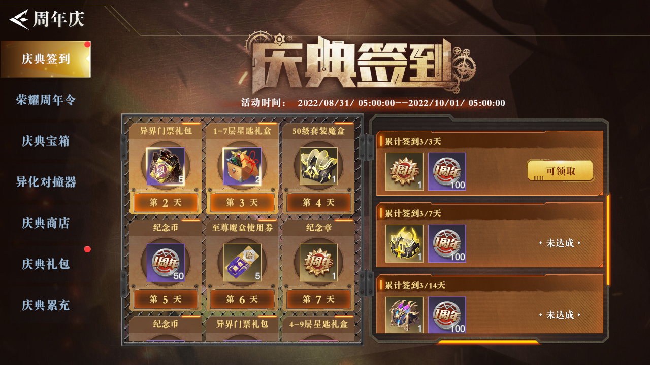 周年庆福利的最核心玩法,一分不氪,每天做完零充党也能白嫖到55级,至尊周年令玩家就能微肝就能拿满各种纪念币、纪念章、新材料奖励!