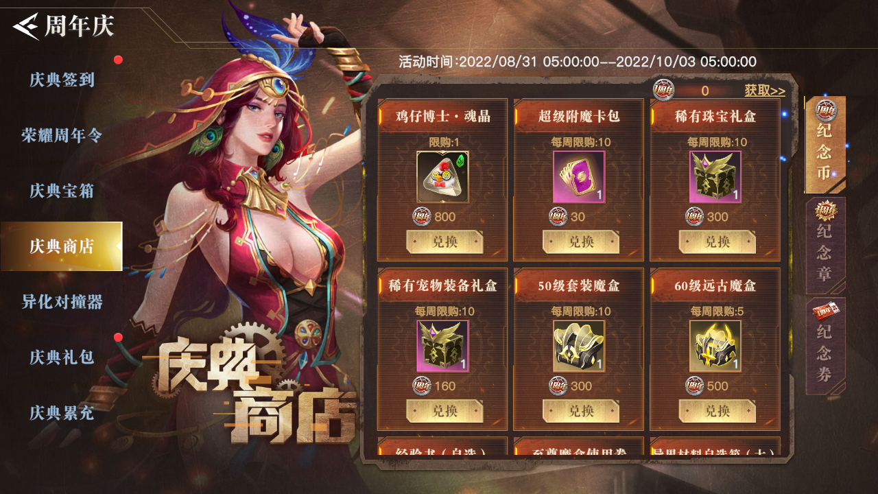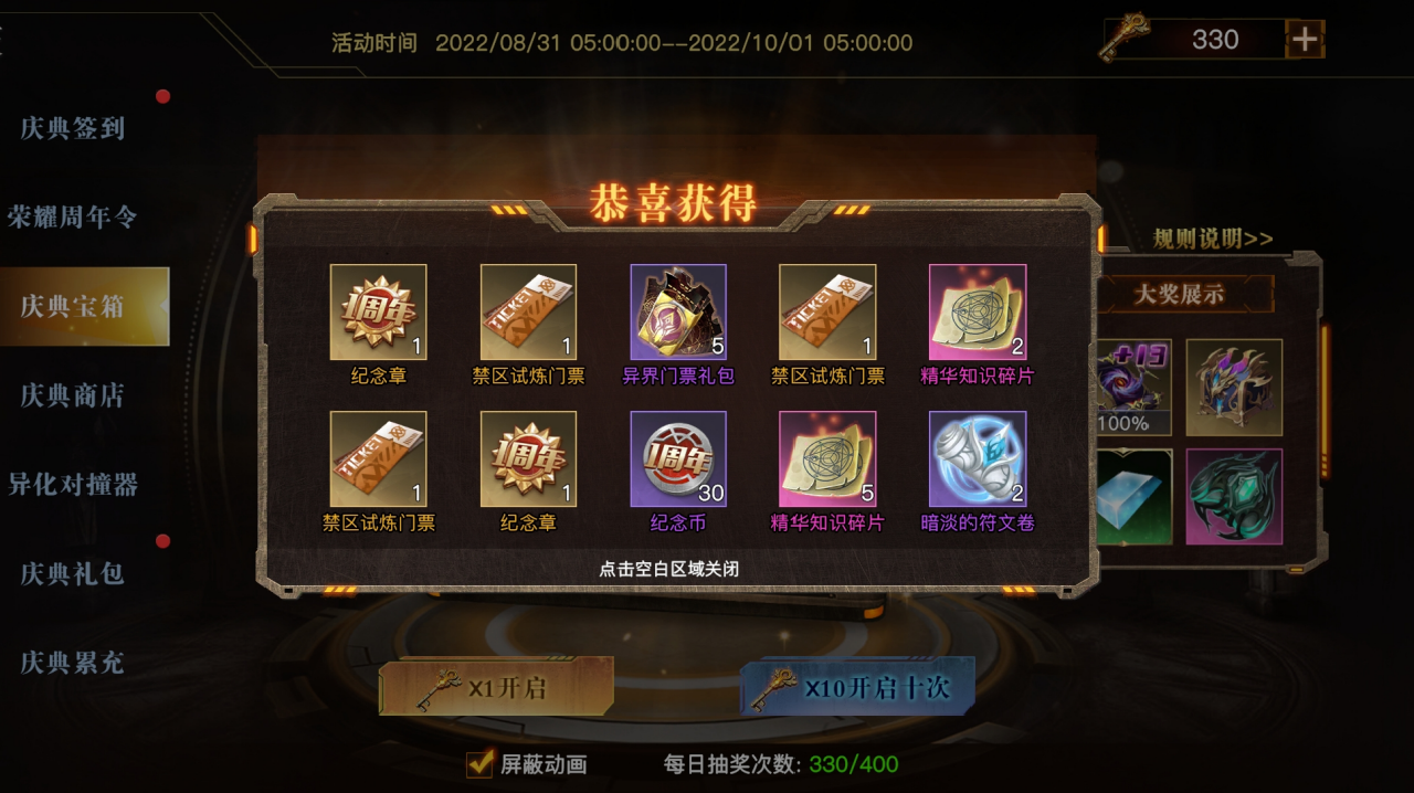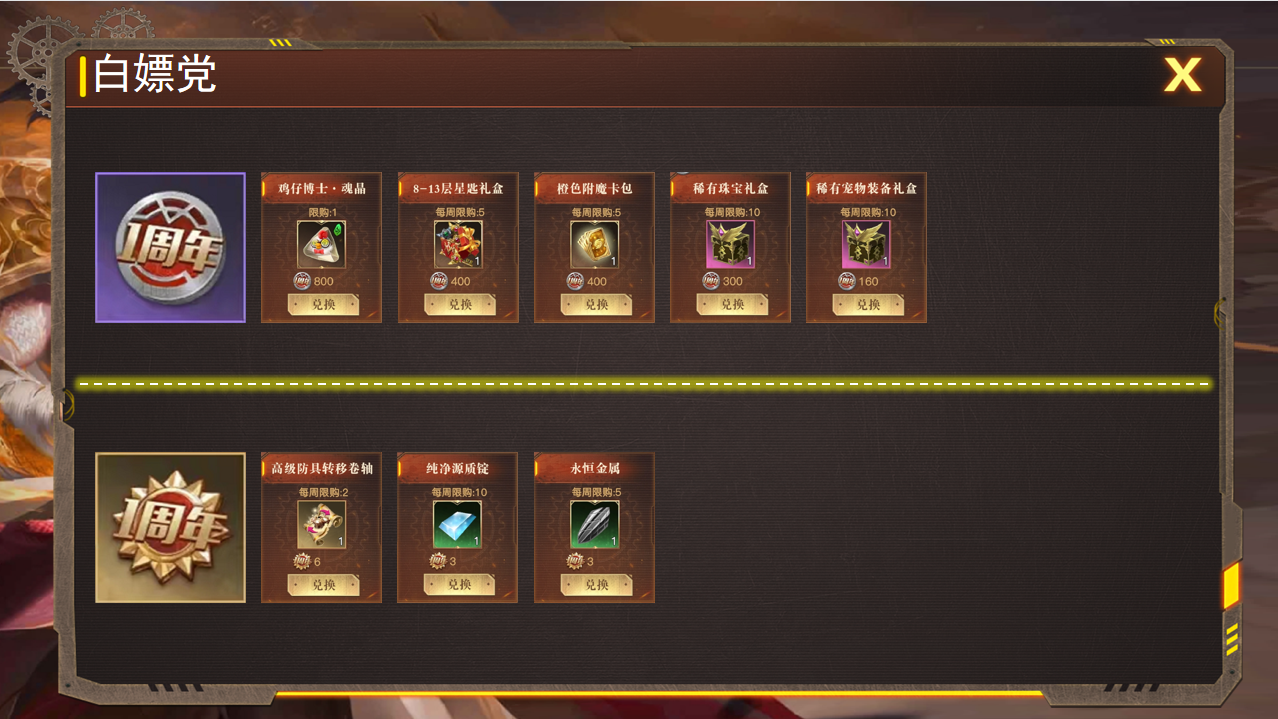 用庆典钥匙开启庆典宝箱,钥匙除了买以外,还能在周年战令里获取哦!又是一个白嫖小技巧!除此之外,三人跨服本【禁区试炼】门票也在这产出,爆率十分高。
