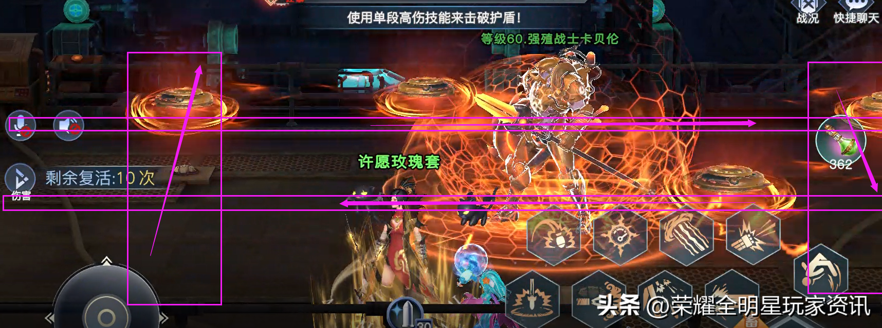 另外在该技能释放过程中,Boss脚下会出现一个能量场护盾,对Boss身边一定范围进行辐射,辐射范围如上图粉色方框所示。