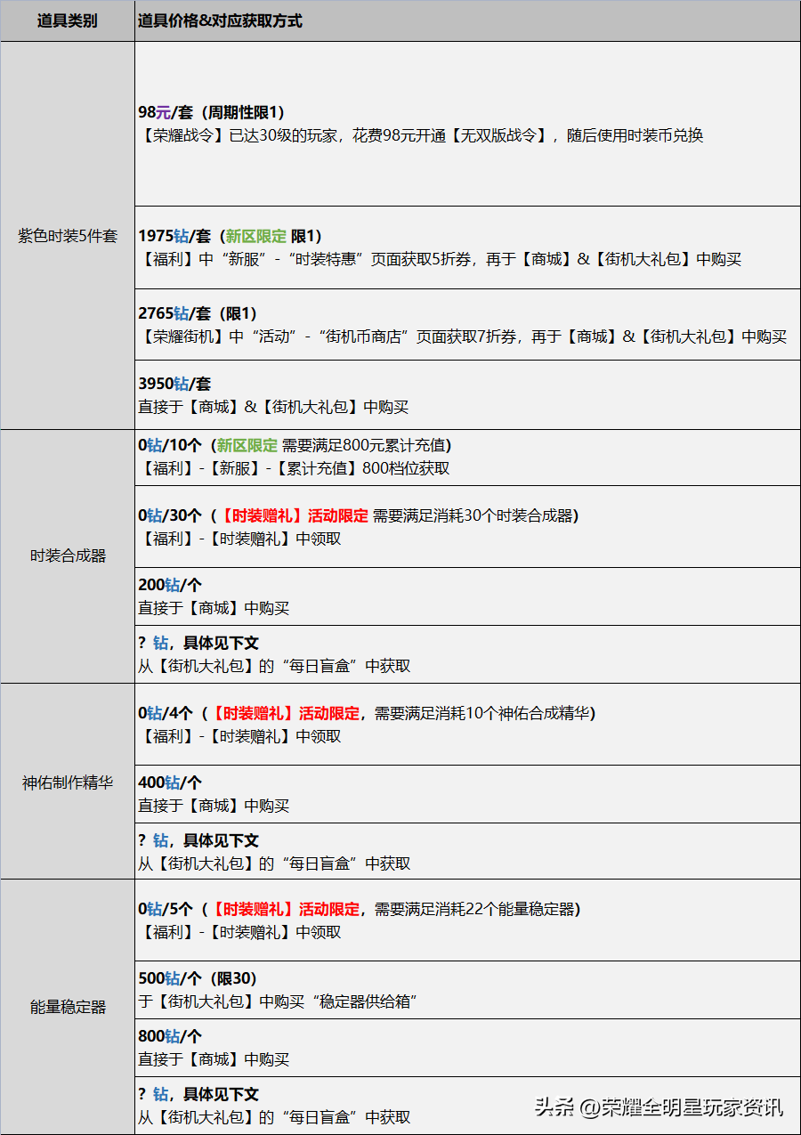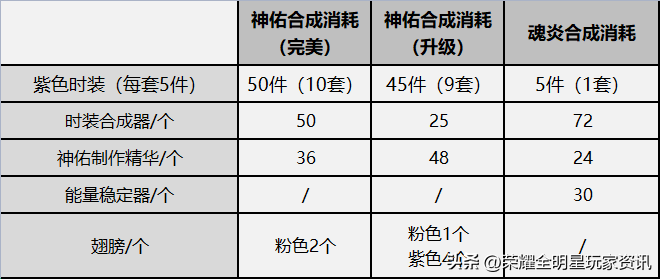 *按照上表3种基础合成道具的价格比,我们可以将“神佑制作精华”视为2个“时装合成器”、将“能量稳定器”视为2.5个“时装合成器”。
