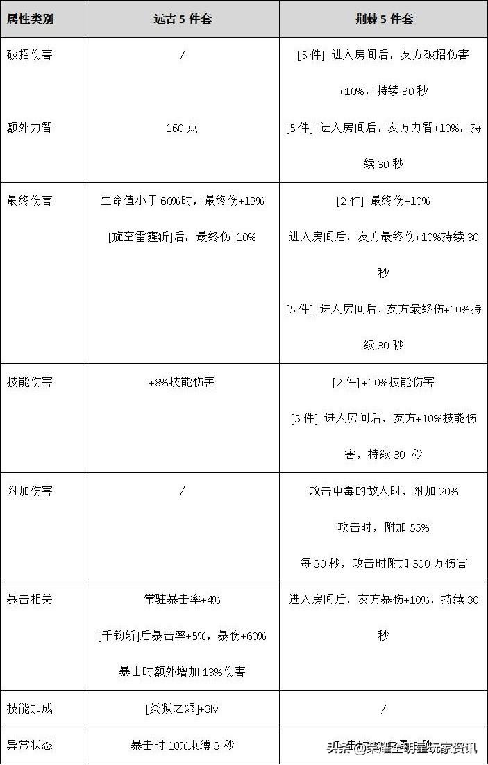 首先按照惯例,为了更直观的看清荆棘套的性能优势,这里南瓜先为大家整理一份远古5件套与荆棘5件套的属性对比表格。由于南瓜自己是炎狱剑主玩家,这里仍然以炎狱剑主的远古5件套为对比标准。
