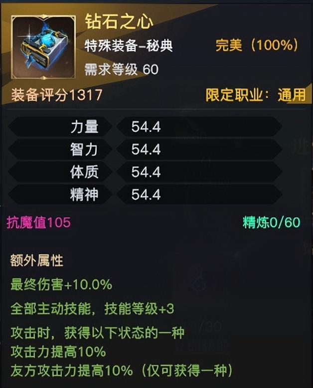 首先是金秘典标配的10%最终伤害提升和全主动技能等级+3,然后就是看运气的装备效果了,攻击的时候就等于开始抽签,上上签全队攻击力提高10%,下签自己攻击力提高10%