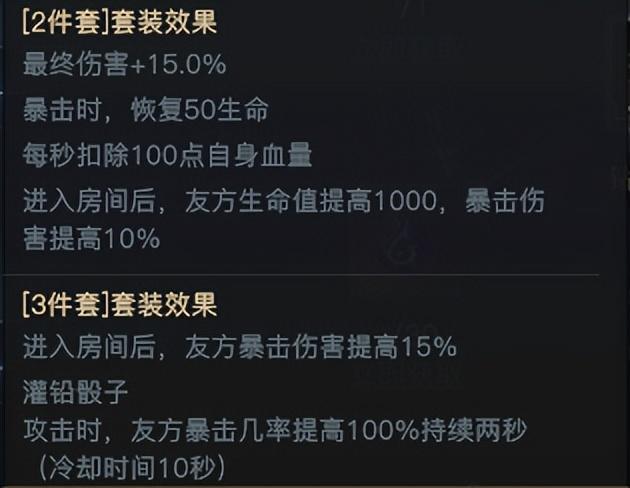 2件套效果:最终伤害提升15%,提升很大,如果是全体提升就更好了;每秒扣100血,暴击回复50血,这个倒是问题不大,不谈这一套极为适用的是奶妈,在现在人均90+的暴击面前,只会血越打越多;最后一个友方生命提高1000,暴伤提升10%很香