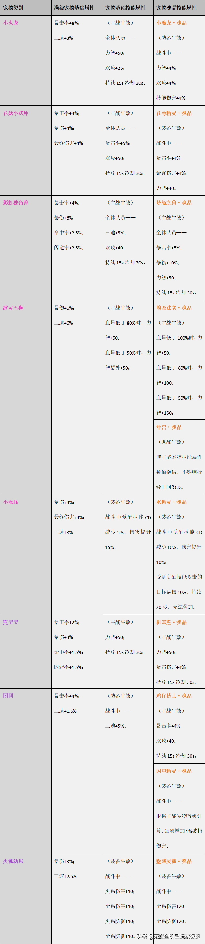 对当前版本所有宠物的基础属性、技能属性、魂晶技能属性进行整理对比的话,可以得出如下表格: