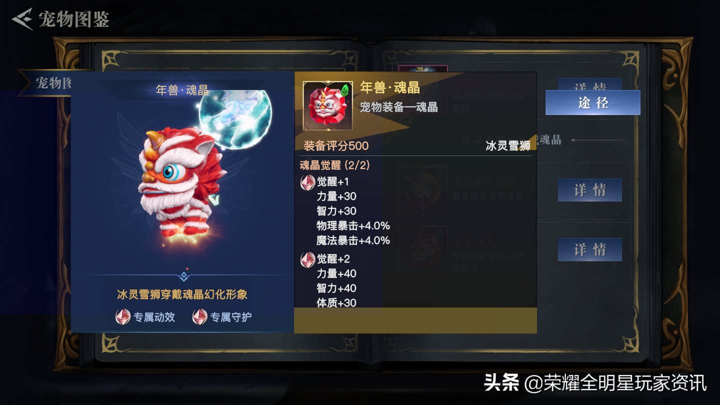 最后说一下年兽——它的魂晶效果相当于让主战宠物的技能效果翻倍,尤其适合搭配水精灵这种能短时间带来显著爆发增益的宠物使用。但如果用年兽搭配花萼精灵&小魔龙的话,由于年兽的基础属性不如另外两个用于搭配的宠物,所以年兽+其中之一的效果不如直接把另外两个宠物都装备上。