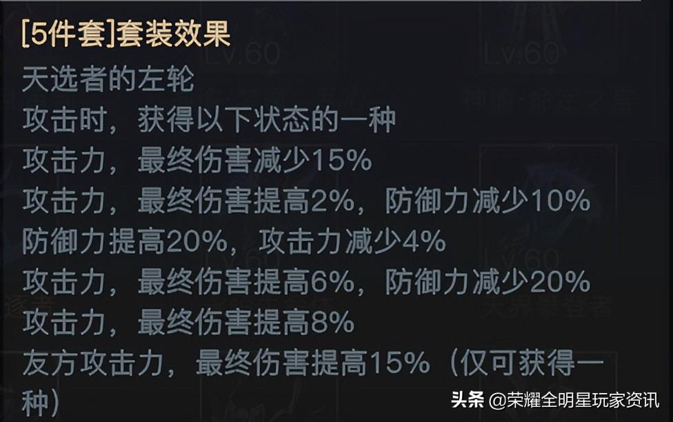 值得一提的是,天选防具的5件套机制Buff会导致该防具在战斗中表现出较大的差异——其1/6几率可以增加全队输出的效果对队伍输出能力可以带来显著提升,但某些条目对防御力的较大影响可能也会对角色生存能力产生负面效果。