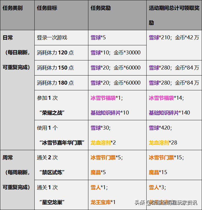 活动期间全勤上述任务总计可获取1190雪球、14冰雪节福袋、15冰雪节门票、3雪人。