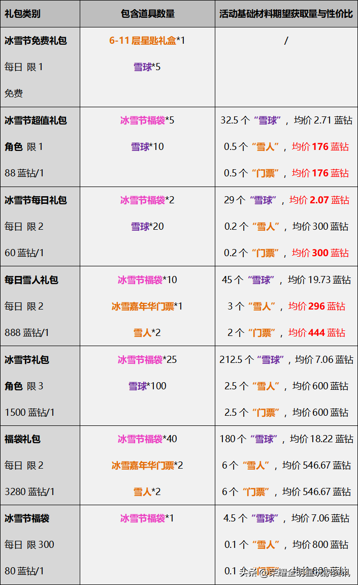 南瓜在上表为大家计算整理了本次各类“冰雪节礼包”的性价比与道具期望获取量(整合了礼包基础道具量+福袋开启后的期望道具量),并且用红色高亮标出了获取不同道具性价比较高的礼包选项,大家可以参考上表并结合个人实际需求选择购买相应的礼包。