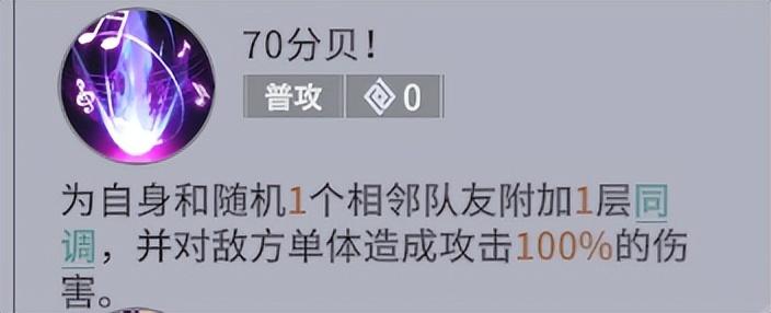 【普攻】70分贝!:为自身和随机1个相邻队友附加1层【同调】,并对敌方单体造成攻击100%的伤害。