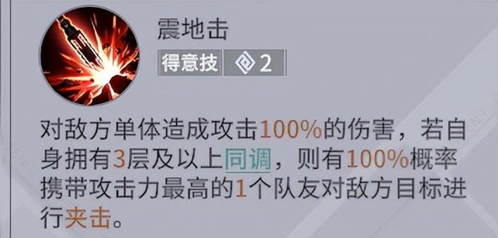 【得意技】震地击:对敌方单体造成攻击100%的伤害,若拥有3层及以上同调,则会携带攻击力最高的1个队友对敌方目标进行夹击。