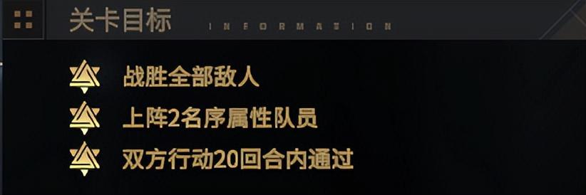关卡目标:战胜全部敌人;上阵2名序属性队员;双方行动20回合内通过