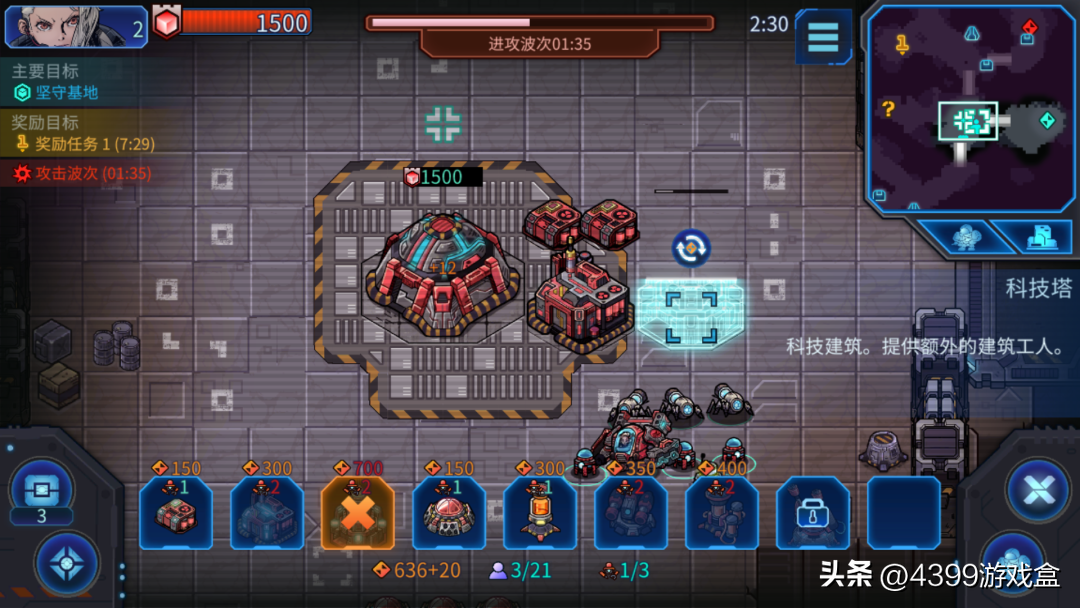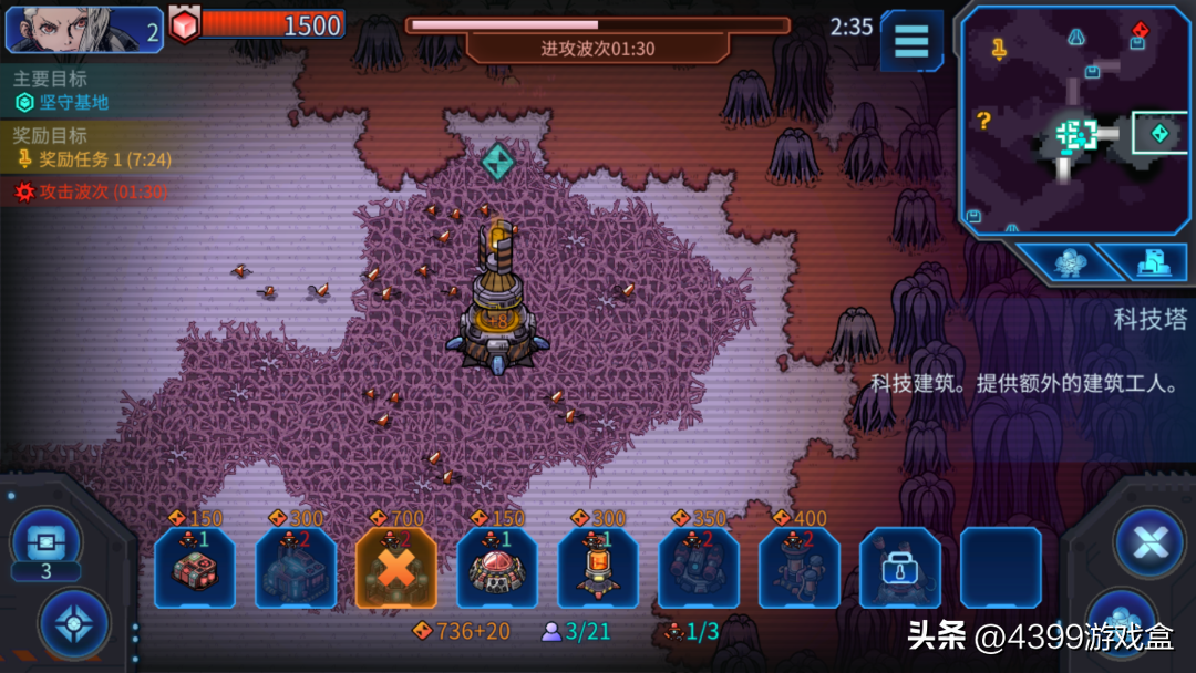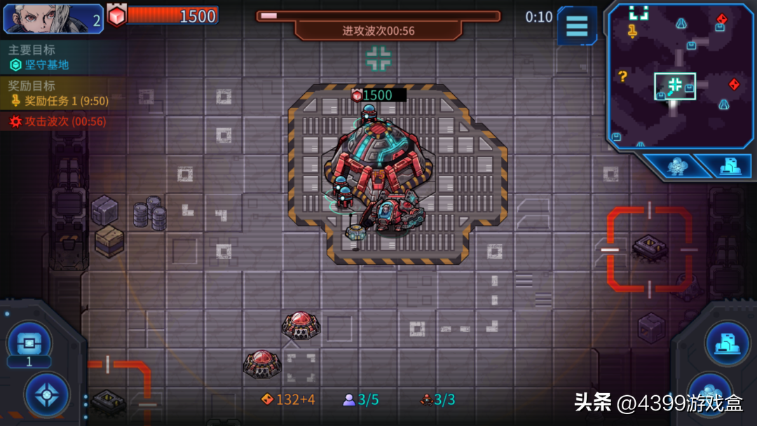游戏不难理解,开局时玩家拥有一个基地和一个英雄加上三个基础士兵、随机数量的防御建筑,地图上会显示敌方的位置以及进攻时间、路线。
