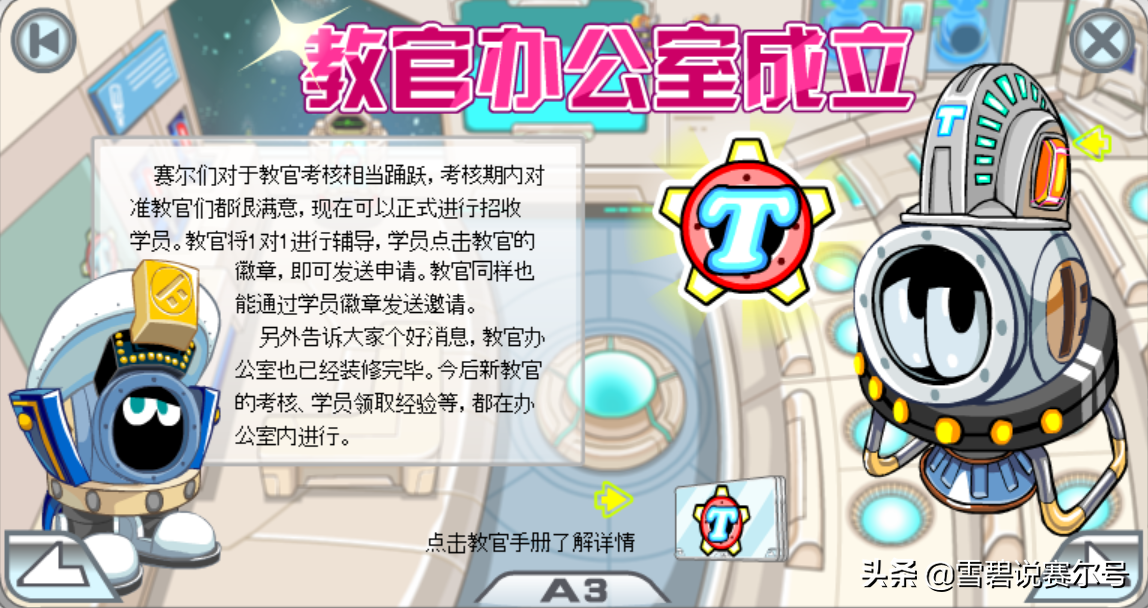 想成为教官,教其它新手赛尔吗?赶快去教官办公室报名吧!原来要去五个星球搜集五样物品。这个我就不说喽,反正只有那么几个地方,很容易看到的,顺便熟悉一下地方啦~(≧▽≦)/~!