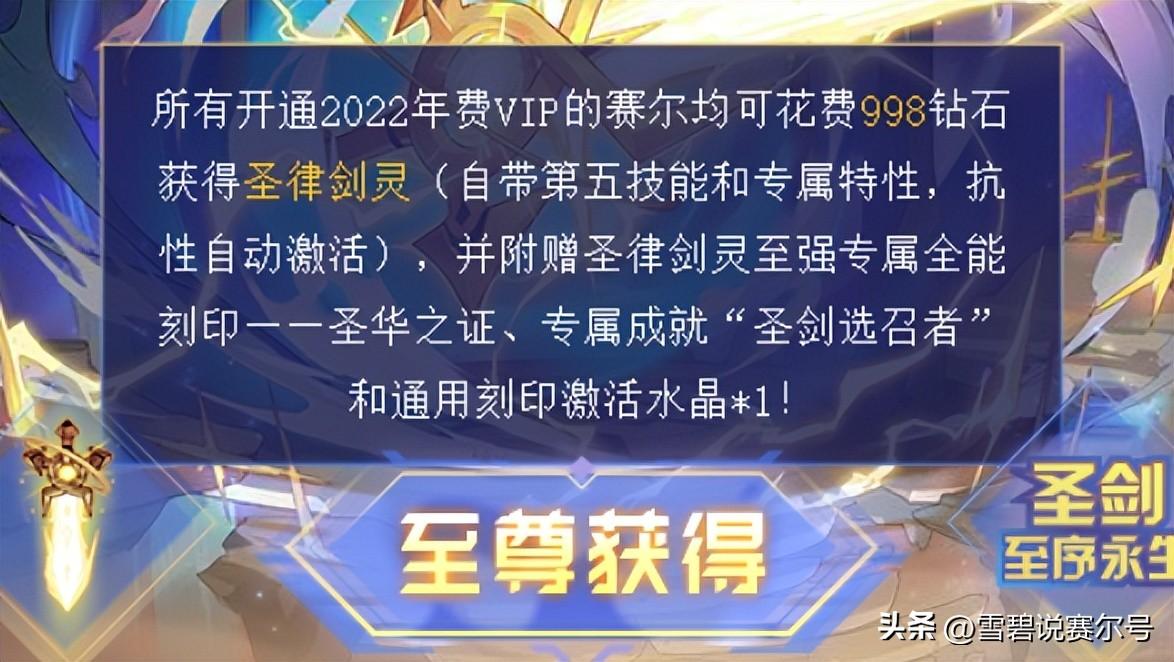 所有开通2022年费VIP的赛尔均可花费998钻石获得圣律剑灵(自带第五技能和专属特性,抗性自动激活),并附赠圣律剑灵至强专属全能刻印——圣华之证、专属成就“圣剑选召者”和通用刻印激活水晶*1!