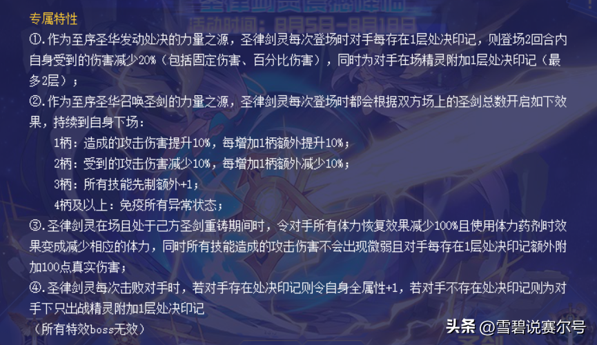 4.圣律剑灵每次击败对手时,若对手存在处决印记则令自身全属性+1,若对手不存在处决印记则为对手下只出战精灵附加1层处决印记 (所有特效boss无效)