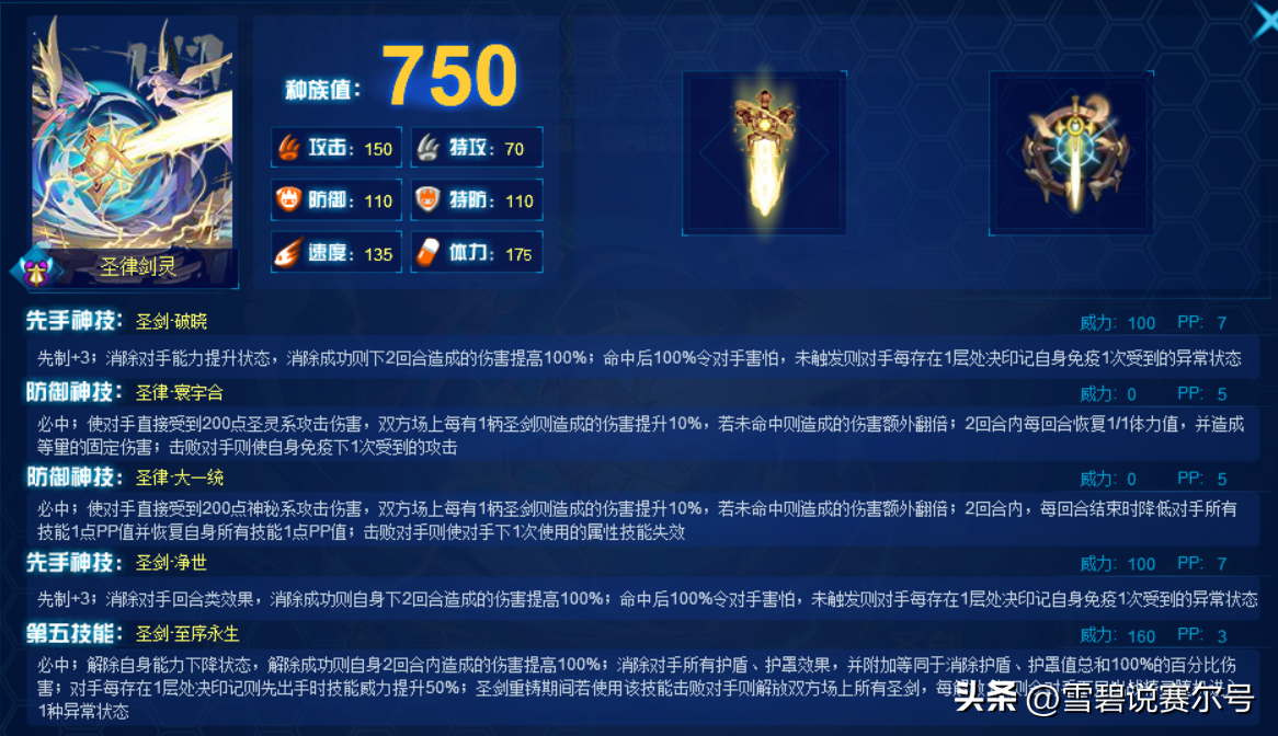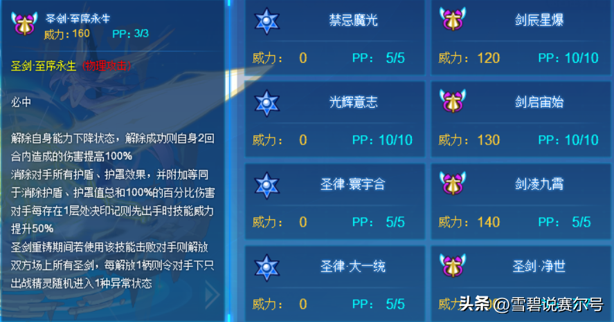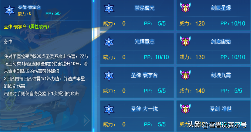圣律·寰宇合:属性攻击,直接受到200点圣灵系攻击伤害,双方场上每有1柄圣剑则造成的伤害提升10%,若未命中则造成的伤害额外翻倍;2回合1:1的最大体力续航和反馈分桑也是让这精灵有了强大的站场续航能力和粉伤输出能力,未击败有盔,保证生存这一点算是一个属性的核心技能了,伤害也比较可观。