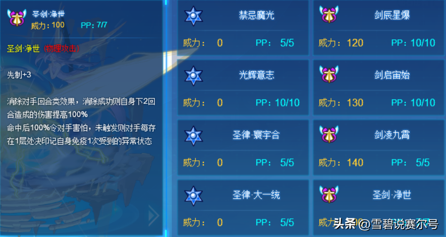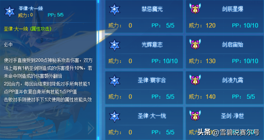圣律·大一统:和寰宇合的效果基本一样,使对手直接受到200点神秘系攻击伤害,补偿效果和翻倍也是一样。2回合内,每回合结束时降低对手所有技能1点PP值并恢复自身所有技能1点PP值;击败封对手属性(1回合)。