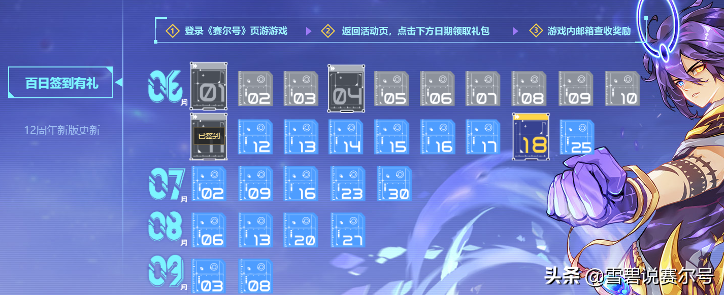这个活动其实从6月1日就已经开始了,截止18日,合计签到最多可得1W8千周年币,换算成许愿券的话也有18张。错过不能补签,所以在有限的时间玩家还是尽量不要错过这个签到活动,毕竟签到的门槛最低,入手也是极为简单。