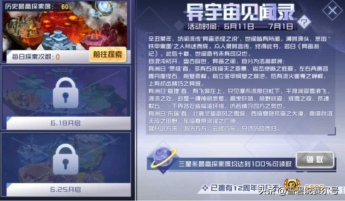 探索活动,活动门槛低回报高,随便参与活动就能获得1K以上的周年币(单次上限是2333币),每日可以参加4次,合计84次计算,共可得19W周年币。具体玩法可以参考自己上局的选项来提高增分项。活动持续到7月初,全部内容探索完成后获得周年庆专属成就【异宇宙探索者】。