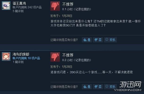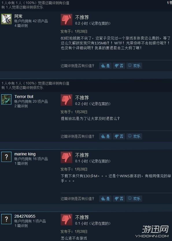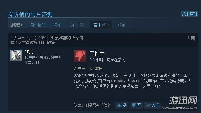 截至发稿前,《三国志13》的评论数为52个,差评44个,好评仅有8个,对于一款刚刚解锁的游戏为何会收到这么多的差评呢?这些玩家当然不是已经神速的玩到了《三国志13》,而是买了却不能玩……难怪会引发这么多的愤怒。原来,虽然价格已经解锁并且开卖,但是据玩家反映,下载下来的并不是游戏本体,而是一个135M的文件,并不是《三国志13》本体,花了390大洋,却不能第一时间玩到游戏,难怪《三国志13》的评价会如此之差。
