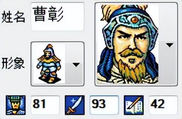 4、武力93--“黄须儿”曹彰,游戏中设定为近卫队。在天荡山之战中作为援军出场,触发的单挑是少有的我军战败(吴兰败,撤退)。