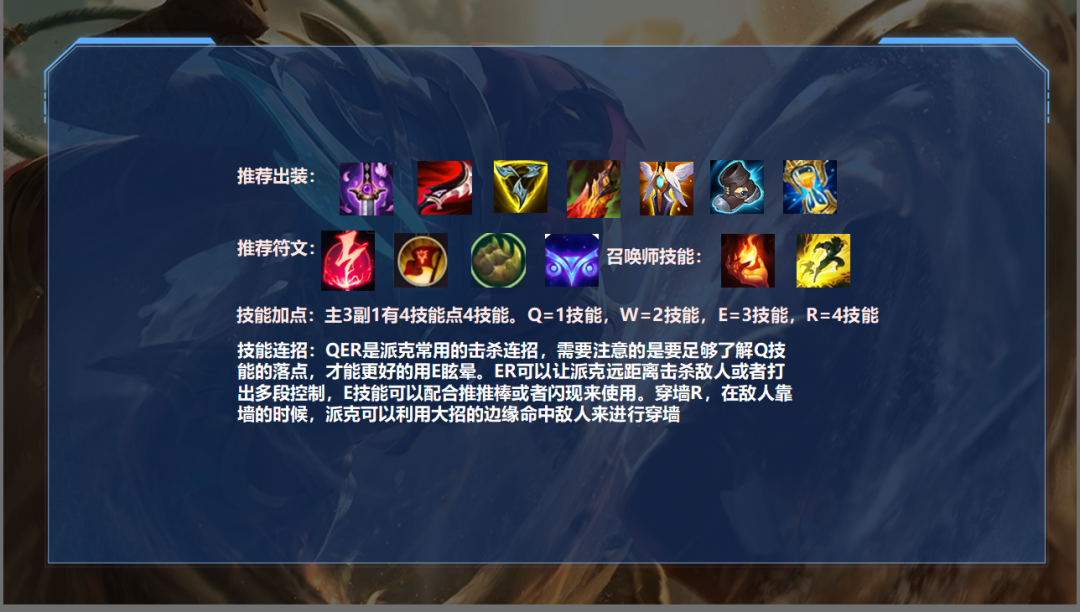 QER是派克常用的击杀连招,需要注意的是要足够了解Q技能的落点,才能更好的用E眩晕。ER可以让派克远距离击杀敌人或者打出多段控制,E技能可以配合推推棒或者闪现来使用。穿墙R,在敌人靠墙的时候,派克可以利用大招的边缘命中敌人来进行穿墙