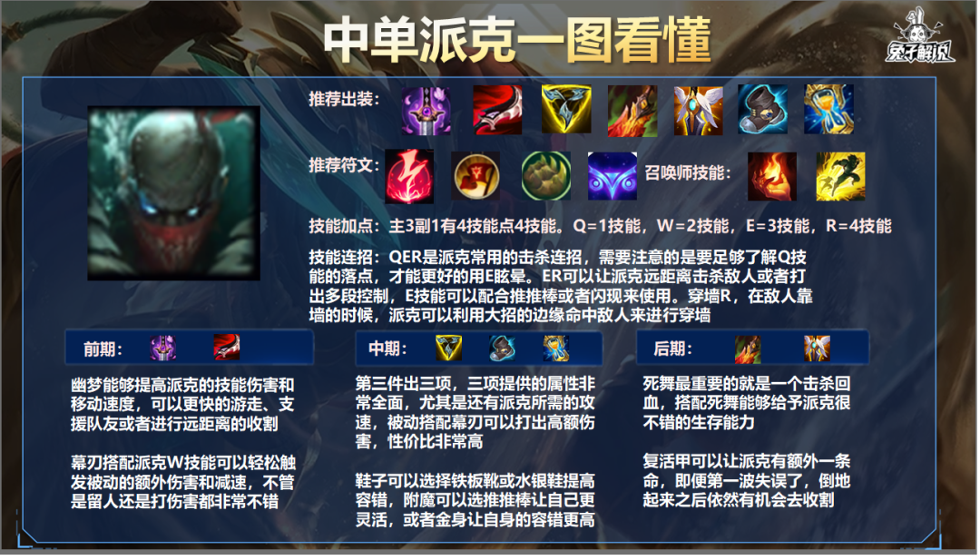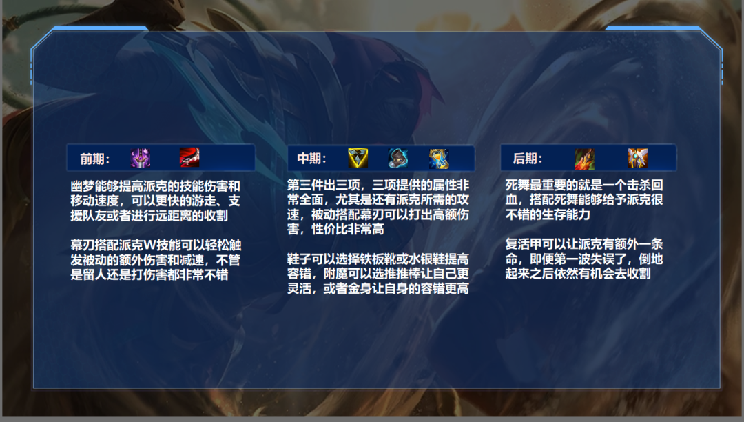 派克前期的单体能力比较弱,装备没有成型时伤害并不会很高,所以前期尽量以发育为主就行。并且派克是很难拿到线权的,但是派克的清线能力相对还行,前期一定要多给队友反馈避免队友被越塔。阵容上也需要队友补出AP伤害,如果我方全是物理输出,那么中后期派克会很无力。