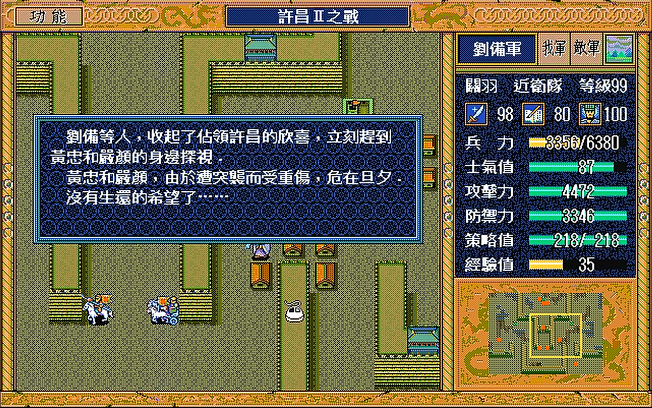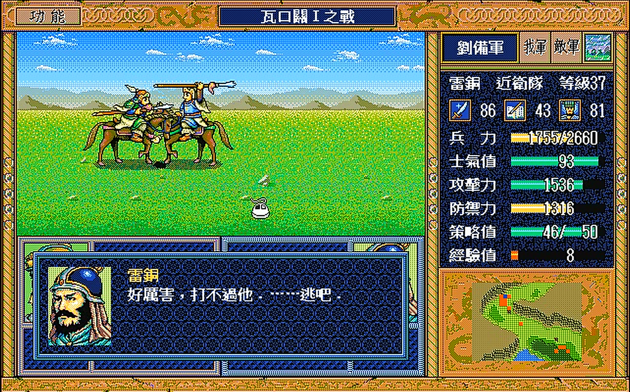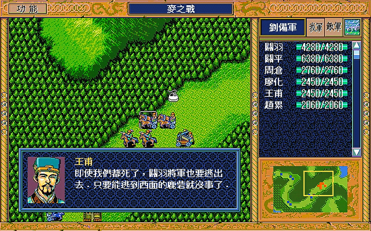 麦之战关羽逃亡这段剧情玩家印象应该特别深,第一次玩到这里,随便怎么试都没有让关羽逃脱,后来在一本电子杂志上看到攻略,给关羽赤兔马,再让他变成步兵,直接从树林中穿过就能逃走了。那么问题来了,当时赤兔马给赵云了,又没有给关羽变步兵的道具,能怎么办呢?凉拌,只能从最近关羽还在队的存档重来,不然的话关羽就是死路一条。