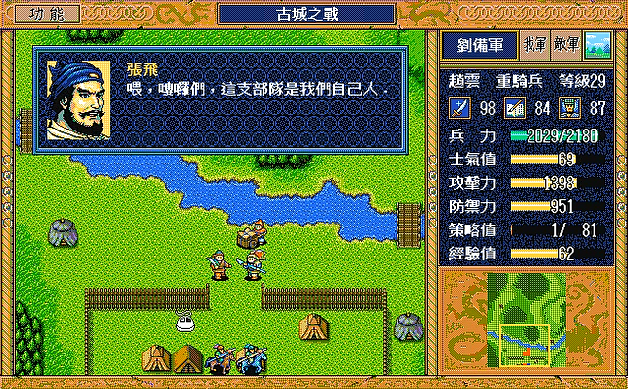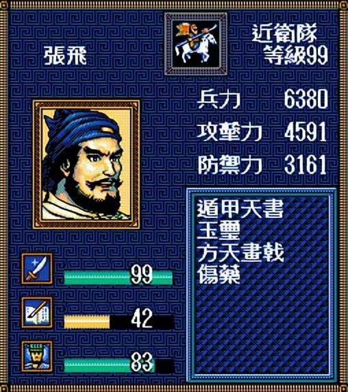 虽然张飞的智力低,但只要不想着转智力型兵种的话还是影响不大,顺便重申一遍,这里说的是初次玩这个游戏的感觉,那时我自己玩,基本不会给将领转职,还陷入了一个很大的误区,那就是骑兵很猛,后来才知道,原来猛的不是骑兵,而是我方的骑兵大多都是猛将,所以才显得骑兵猛。