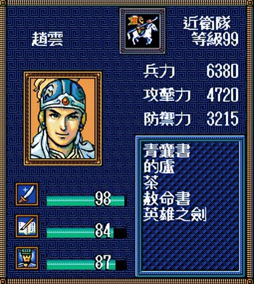 武力98,智力80,统率100,非常全面,是游戏中属性综合最高的。