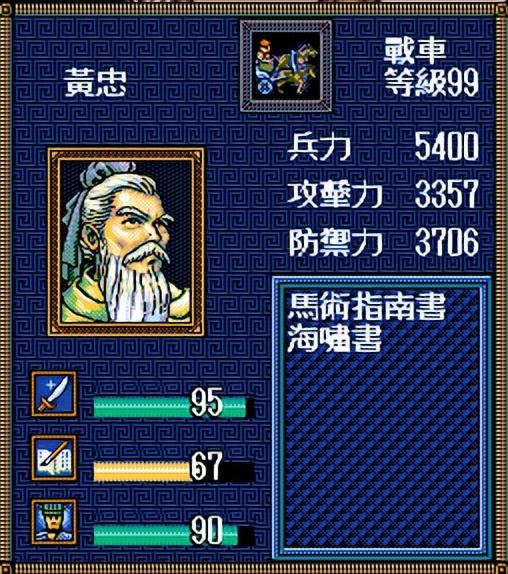 武力95,智力67,统率90。五虎将中武力最低的,兵种也是步兵,其他4位都是骑兵,但游戏中的兵种可以依靠道具来变化,所以兵种方面不考虑。
