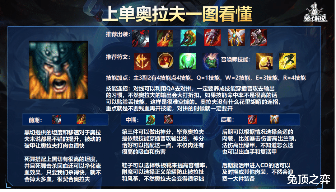 奥拉夫的出装相对来说不算是很灵活,不管版本如何的去改动调整,只要不重做,那么奥拉夫线上的打法和中心思路都是没有太大变化的。
