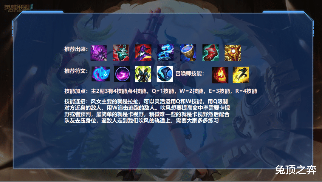 风女主要的就是拉扯,可以灵活运用Q和W技能,用Q限制对方近身的敌人,用W追击逃跑的敌人。吹风想要提高命中率需要卡视野或者预判,最简单的就是卡视野,稍微难一些的就是卡视野然后配合队友去压身位,逼敌人走到我们吹风的轨道上,需要大家多多练习